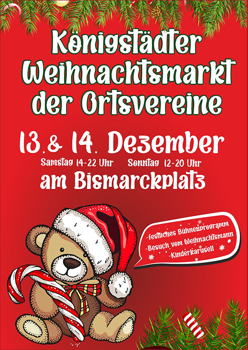 Am dritten Adventswochenende findet zum Sechsunddreißigsten Mal der beliebte Weihnachtsmarkt der Ortsvereine in Königstädten auf dem Bismarckplatz statt.